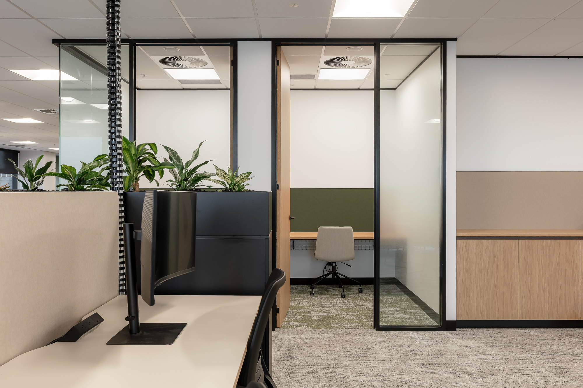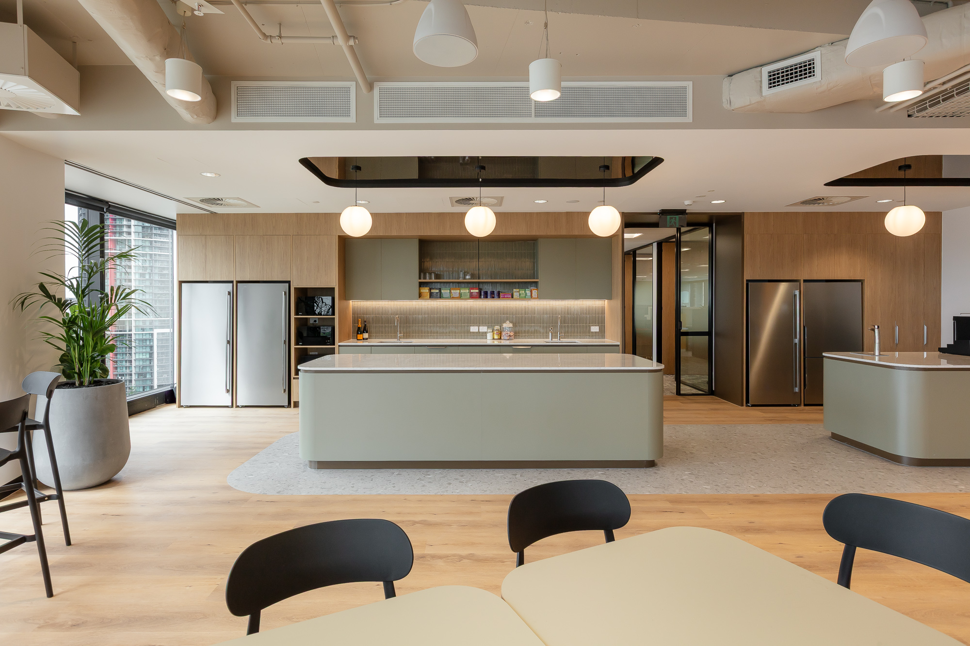 Spanning 1,207sqm, the new workplace prioritises flexibility and collaboration. Traditional offices were reduced in favour of open, adaptable zones, acoustic meeting spaces, and sit-to-stand workstations. Highlights include bespoke Corian joinery in reception, a tech-enabled kitchen and coffee bar for events and town halls, and a dedicated wellness room.